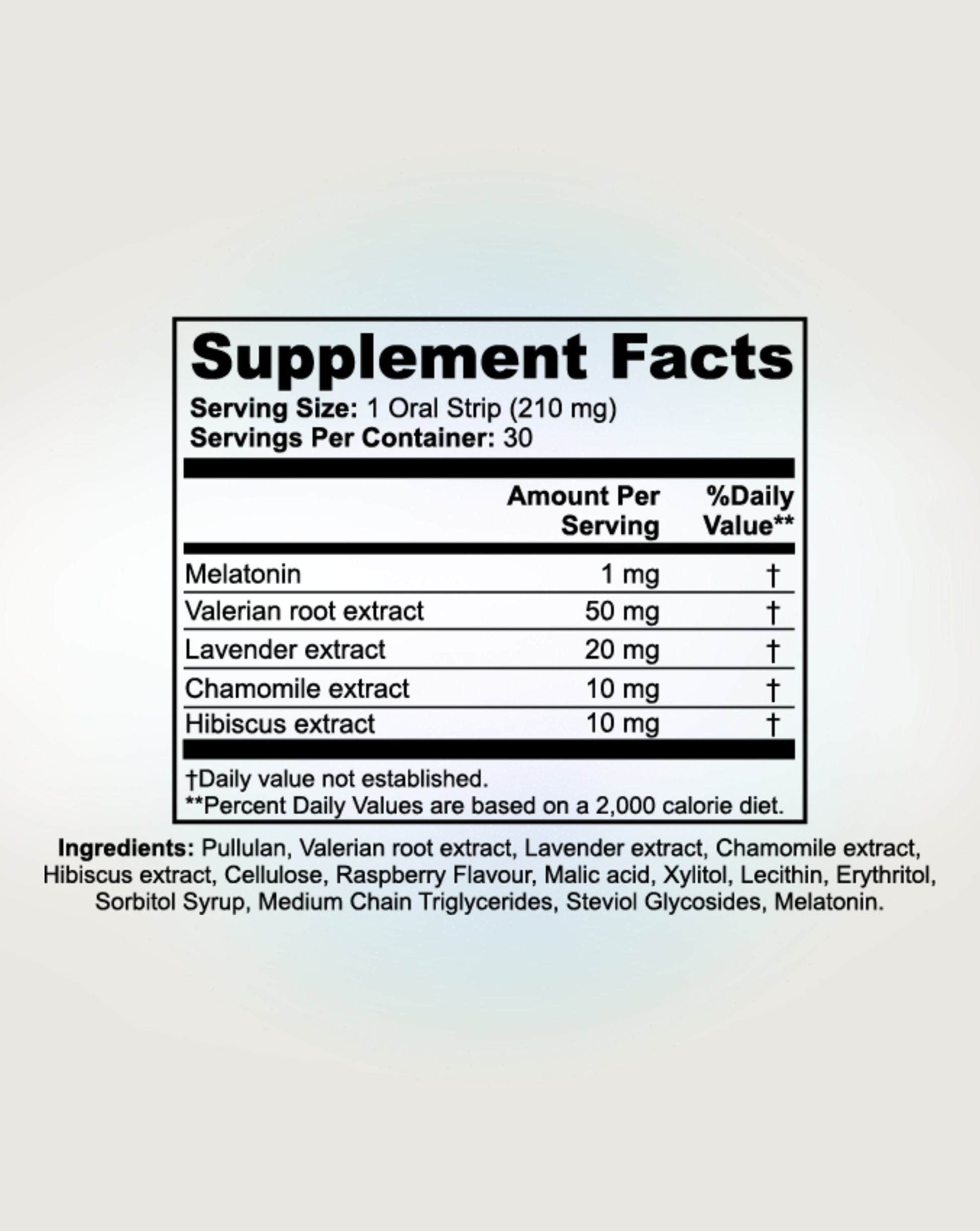 Valerian extract, Lavender, Chamomile, Hibiscus Extract, and Melatonin all have properties that can help promote relaxation and improve sleep quality, which can work together to create a synergistic effect on the body and mind, leading to better overall health and well-being, making it the perfect non-addictive sleeping aid. Sleep oral strips are easy-to-take - have them anytime before bedtime for maximum results.*